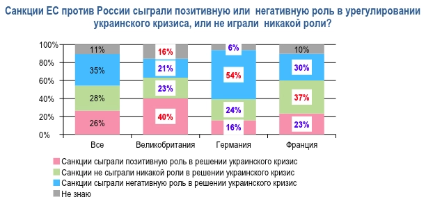 Согласно данным социологов, более трети европейцев (35%) считают, что санкции ЕС в отношении России сыграли негативную роль в урегулировании украинского кризиса. Доля тех, кто положительно оценил влияние санкций на разрешение ситуации на Украине, меньше и составляет 26%.