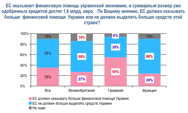 В целом 55% опрошенных европейцев считают, что ЕС больше не должен выделять деньги на помощь Украине и только треть, то есть 35%, напротив, проголосовали за увеличение объемов финансовой помощи. Напомним, с мая текущего года в рамках двух существующих программ макрофинансовой поддержки Украины Евросоюзом общим объемом 1,6 миллиарда евро было выделено уже 860 миллионов евро.