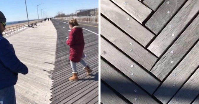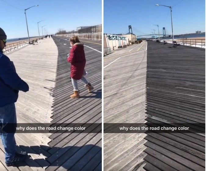 Пользователь сайта Reddit с ником benjanator862 обратил внимание, что набережная Статен-Айленд в Нью-Йорке меняет свой цвет в зависимости от того, с какого места на неё смотреть. Блогер снял видео и предложил подписчикам объяснить, что там происходит. Мнения пользователей разделились. Одни выдвинули невероятные версии, что это чёрная магия, другие — что это удивительная дорога-хамелеон, но нашлись и те, которые смогли объяснить оптическую иллюзию с точки зрения науки.