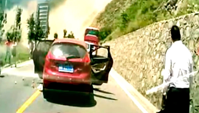 На кадрах, выложенных в сеть, видно, как люди покидают машины и спасаются от внезапно обрушивающейся стихии. Тяжелые камни настигают убегающих автомобилистов.