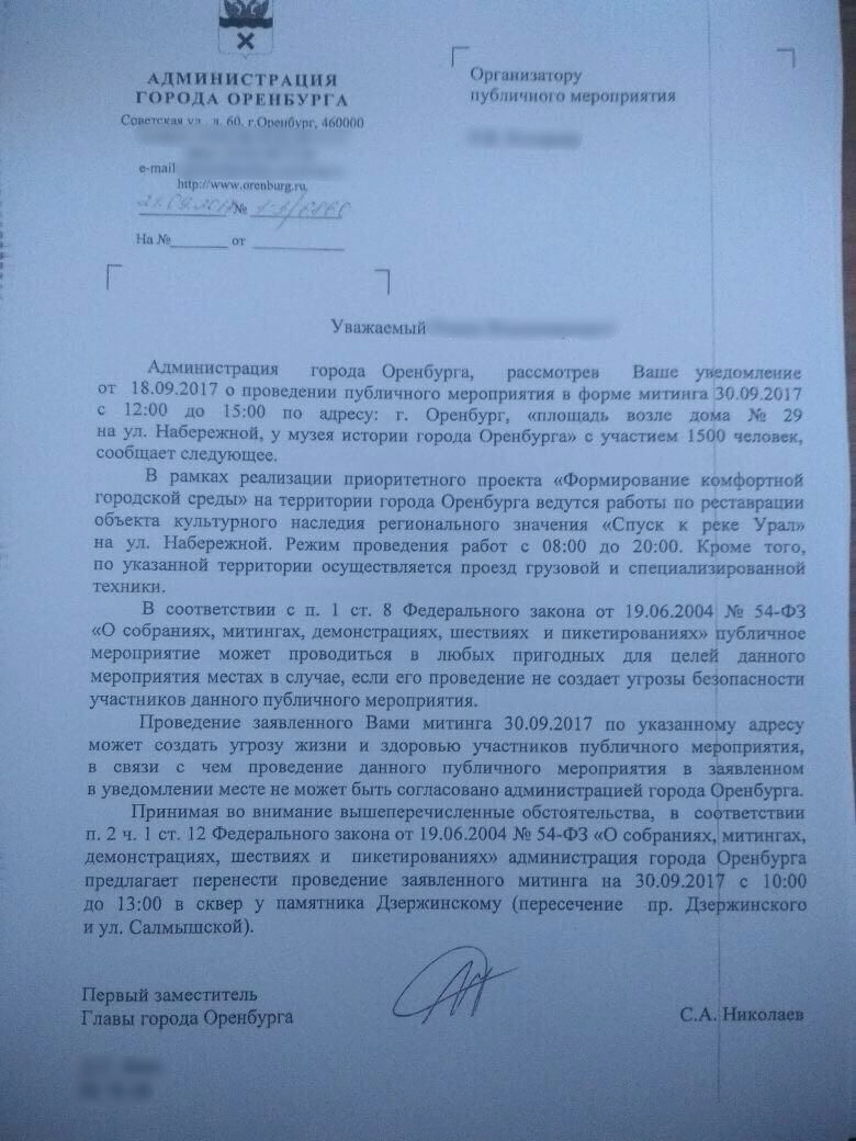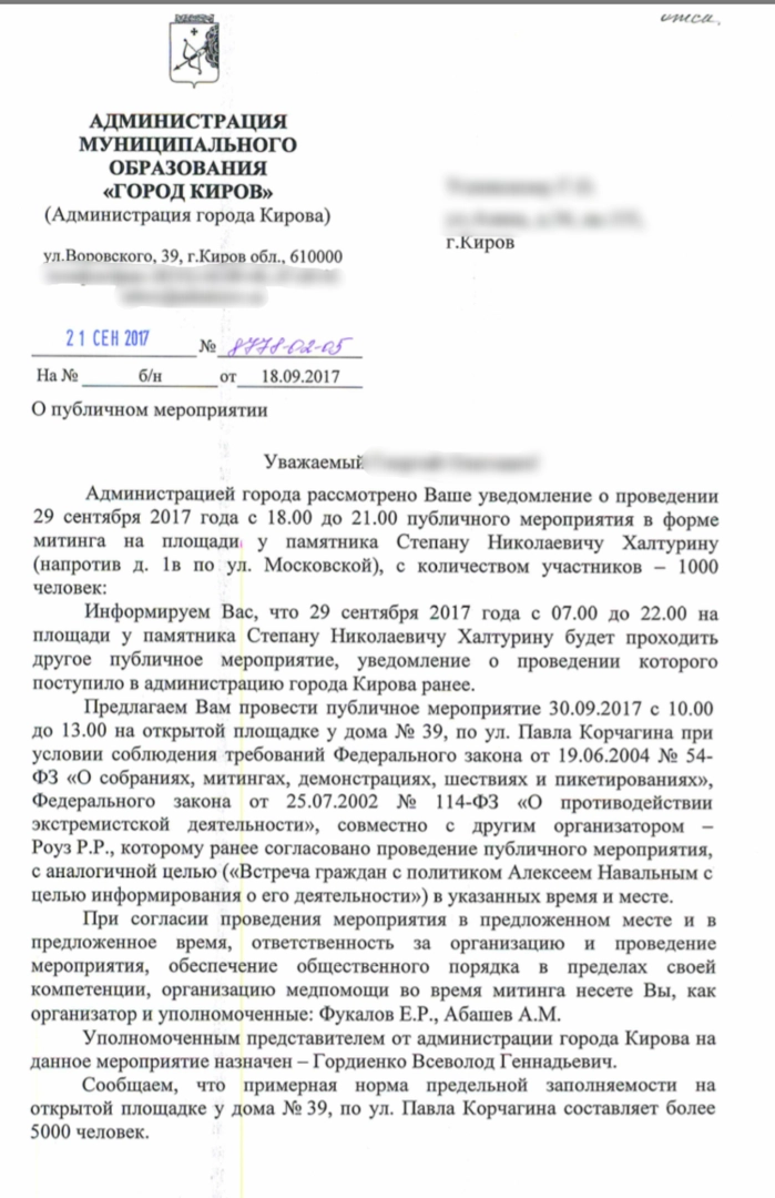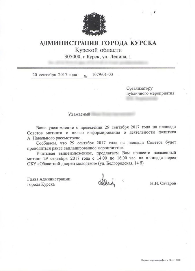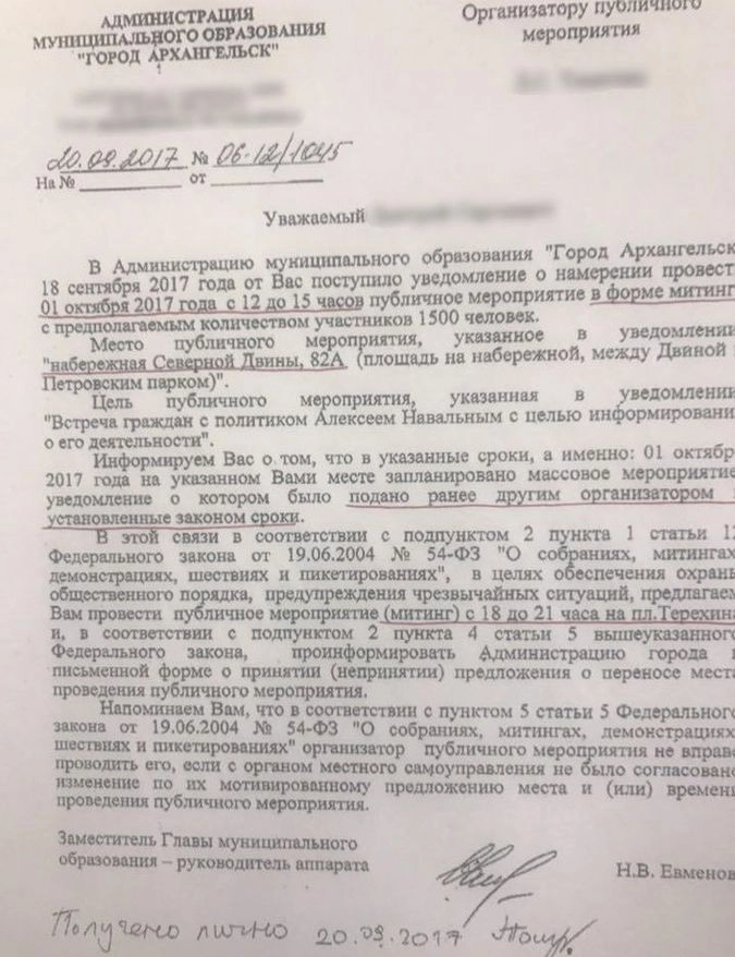 В Сети опубликованы копии разрешительных документов на мероприятия, запланированные блогером Алексеем Навальным в конце сентября и начале октября 2017 года.
