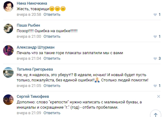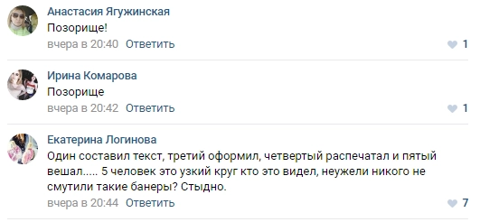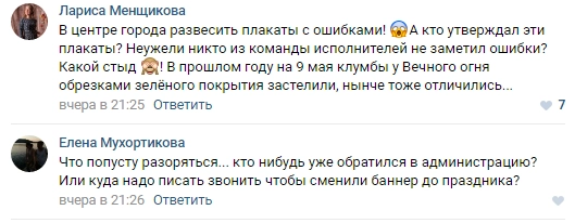 Участников группы «Типичный Курган» в соцсети «ВКонтакте» возмутили неграмотность создателей баннеров и недосмотр городских служб. «Как в одной строчке из 3 слов совершить 4 ошибки?», «Стыдно за них. Неужели не поменяют?» — негодовали они.
