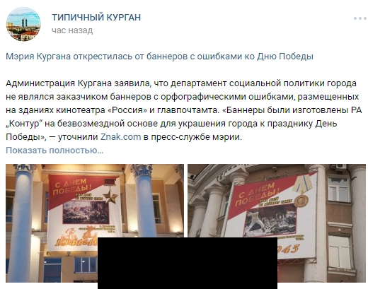 Позже в соцсети было опубликовано заявление администрации Кургана, в котором говорится, что департамент социальной политики города не являлся заказчиком баннеров с орфографическими ошибками, размещенных на зданиях кинотеатра «Россия» и главпочтамта.