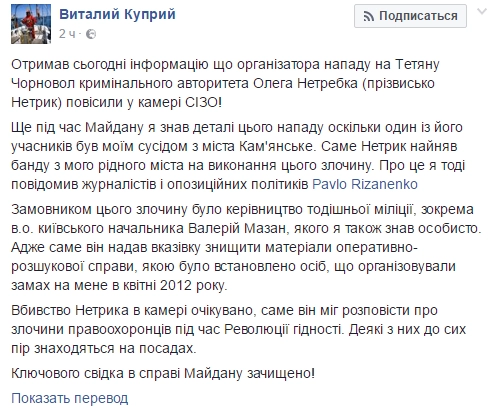 «Убийство Нетрика в камере ожидаемое, именно он мог рассказать о преступлениях украинских силовиков во время Революции достоинства. Некоторые из них до сих пор находятся на должностях. Ключевой свидетель по делу Майдана зачищен!» — написал в Facebook нардеп.