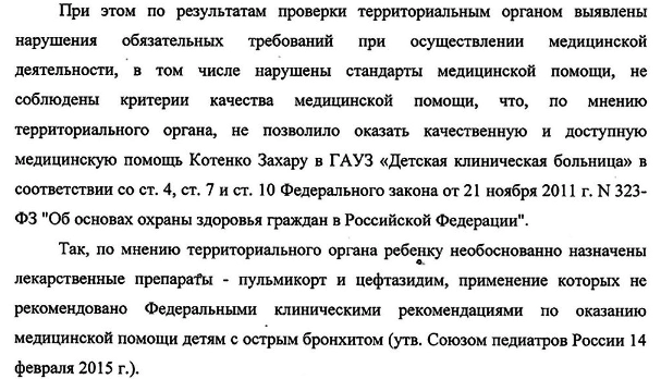 Проверки Росздравнадзора и министерства здравоохранения Республики Бурятия показали, что в больнице при лечении Захара действительно допустили массу ошибок. Ребенку необоснованно назначались не рекомендованные для детей лекарства, не проводились консультации со специалистами и анализы.