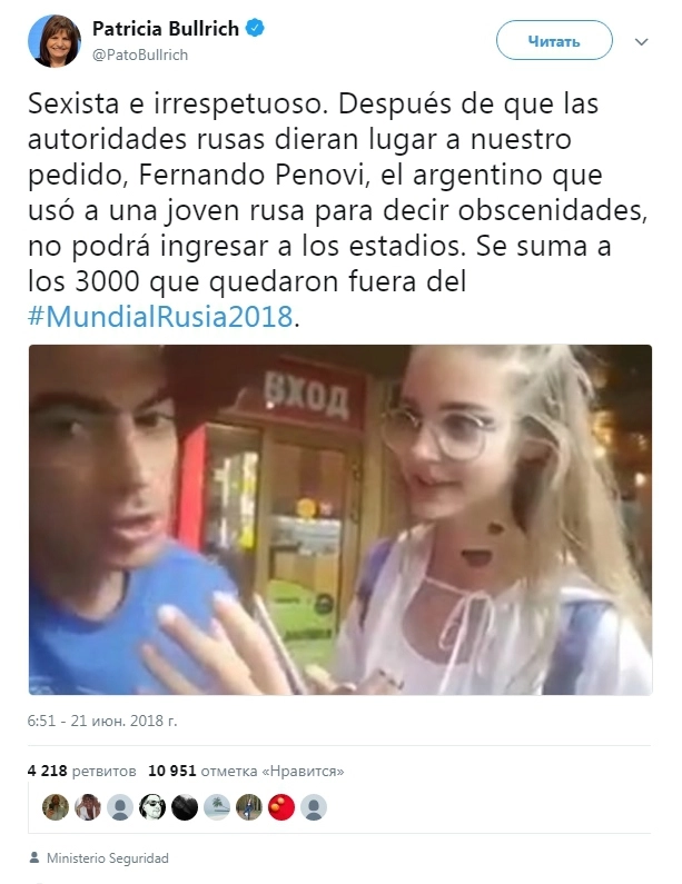 «После того как российские власти получили наше обращение, Фернандо Пенови, оскорбившему российскую девушку, закроют доступ на стадионы ЧМ», — написала она в своем Twitter.