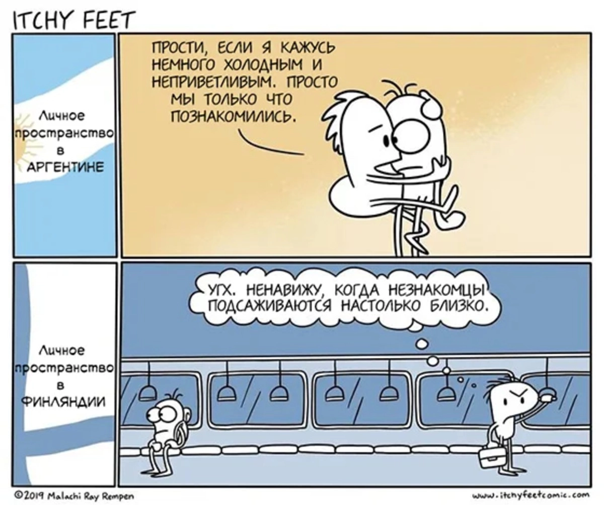 В одних странах люди общаются на очень близком расстоянии, даже с незнакомцами — это считается проявлением уважения, например, в Аргентине. В других странах личное пространство неприкасаемая зона и ценится выше всего — например, в Норвегии и Финляндии. Люди, стоящие на остановке в пяти метрах друг от друга — это абсолютная норма — рассказывает художник и путешественник Малахи Рэй Ремпен (Malachi Ray Rempen).