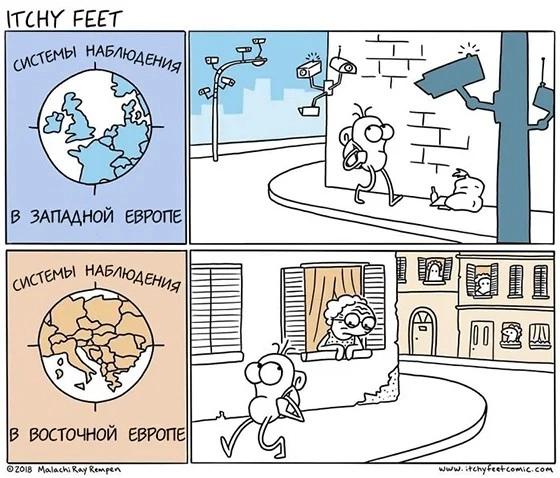 В западной Европе нельзя ступить и шагу, чтобы не попасть в объектив какой-нибудь камеры. В восточной Европе камер гораздо меньше, зато из окон и с лавочек на тебя всё время с любопытством глазеют местные жители.