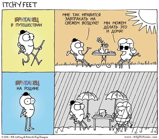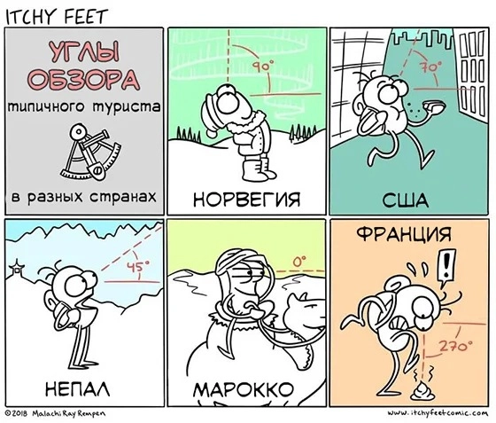 Серия весёлых комиксов о путешествиях называется Itchy Feet, на русский язык их перевели на портале ComicHub.