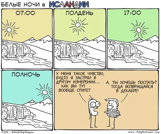 В Исландии летом вообще не темнеет! Почти три месяца в году здесь круглые сутки светло, представляете? Не понимаю, как можно жить и спать в таких условиях и не сойти с ума?!
