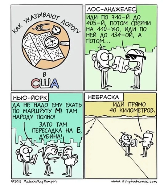 США, наверное, самая необычная страна, в которой я бывал. У каждого штата свои особенности. Например, если вы спросите дорогу в Лос-Анджелесе, то услышите в ответ набор цифр — многие улицы здесь пронумерованы. В Нью-Йорке весь трафик крутится вокруг метро, маршруты обозначены буквами, и местные жители часто спорят, как быстрее добраться до того или иного места. А вот в Небраске всё проще — ты просто идёшь вперёд и в конце концов приходишь туда, куда нужно.