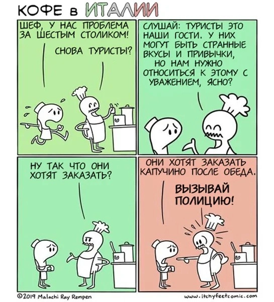 Интересно, что итальянцы пьют капучино только утром, до полудня. Если туристы попросят, они вряд ли откажут, но будут очень удивлены и даже слегка раздражены, если вы закажете капучино после обеда.
