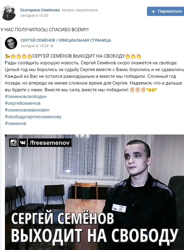 «Рады сообщить хорошую новость. Сергей Семенов скоро окажется на свободе. Целый год мы боролись за судьбу Сергея вместе с вами, боролись и не сдавались. Каждый из вас не остался равнодушным, и вместе мы победили», — написала в социальной сети «ВКонтакте» сестра молодого человека Екатерина Семенова.