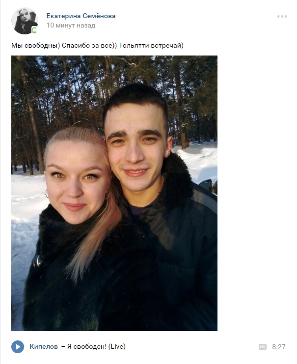 Сестра осужденного Екатерина Семенова опубликовала совместную фотографию с ним. «Мы свободны! Спасибо за все. Тольятти, встречай!» — написала она.