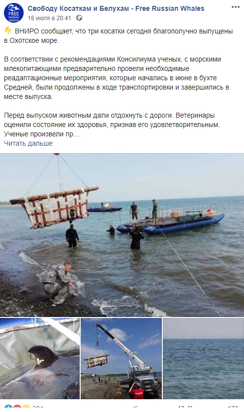 Освобождение косаток и белух, содержавшихся отловщиками в «китовой тюрьме» в бухте Средней, началось 27 июня. На первом этапе операции на волю уплыли две косатки и шесть белух. Три косатки — самец и две самки, за которыми следят сегодня, были выпущены на втором этапе 16 июля.