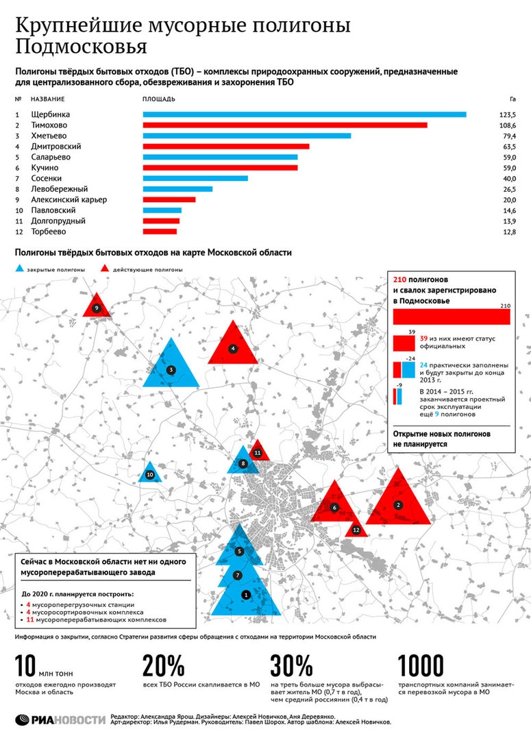 Нынешний год в этом отношении стал поворотным. К его началу в Московской области действовало 39 официальных мусорных полигонов (и свыше 200 неофициальных). Миллионы тонн отходов находили там последний приют годами. Конечно, с течением времени их ресурс исчерпался. Закрыта главная до недавнего времени московская свалка в Долгопрудном. Всего к концу 2013 года прекратили приём мусора две трети полигонов. Оставшиеся закроют к 2015-му.