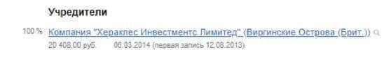 Ее единственным учредителем числится компания «Хераклес Инвестментс Лимитед», зарегистрированная в офшорной зоне на Британских Виргинских островах.