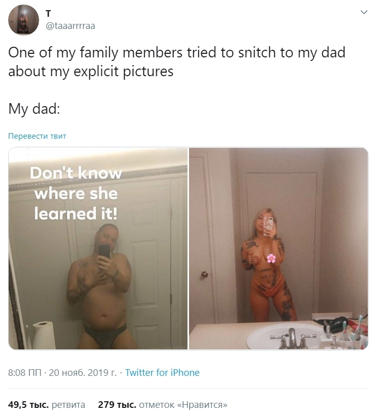 Фотографии увидел родственник Тары, который решил рассказать об этих кадрах отцу девушки. Но тот отреагировал не так, как можно было бы ожидать. Мужчина сделал фотографию в трусах в похожей позе и подписал снимок так: