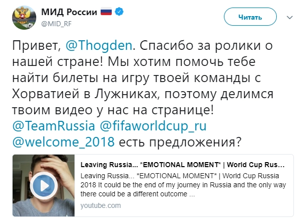 Российский МИД, очарованный репризами молодого человека и его отца, после очередного видео, размещенного Огденом на своем youtube-канале, даже попросил FIFA помочь блогеру с поиском билета на матч Англии и Хорватии в «Лужниках», о чем было сообщено в аккаунте ведомства в Twitter.