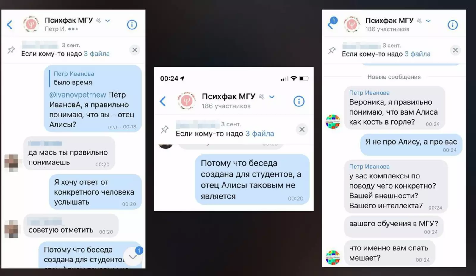 Под картинками отец Алисы Тепляковой подразумевает скриншоты из закрытого паблика для студентов Психфака МГУ в ВКонтакте. Под именем «Петр Иванова» Евгений Тепляков добавился в эту группу и активно переписывается со студентами. По их словам, он постоянно срывается на грубости и оскорбления в комментариях различных сообществ МГУ, а на пары приходит в футболке и шортах.