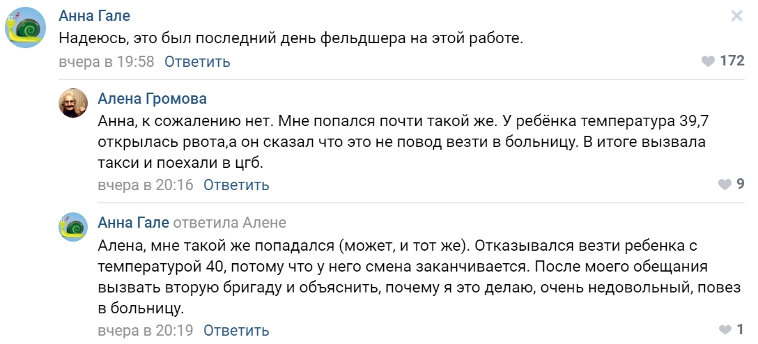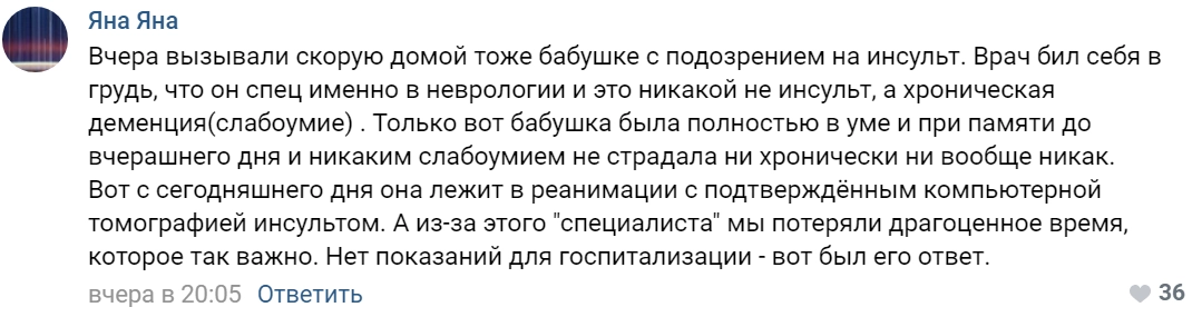 По его словам, бабушку пыталась госпитализировать и вторая бригада, но по пути она била ногами и оскорбляла фельдшера и водителя, а в итоге снова отказалась от госпитализации и не доехала до медицинского учреждения.