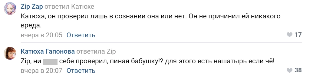 На вид ей лет 60. Бабушка говорила, конечно, что пиво пила, но она не в хлам полнейший была. На вопросы через раз отвечала, но она реально старенькая, — сообщил автор поста.