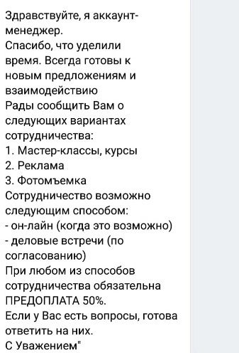 По словам Артемии, для нее лучший способ «отсеить» ненадежного клиента — попросить предоплату в 50 процентов. Потенциальным клиентам можно представиться моделью, фотографом или фитнес-тренером, а сообщения для рассылки выглядят примерно так:
