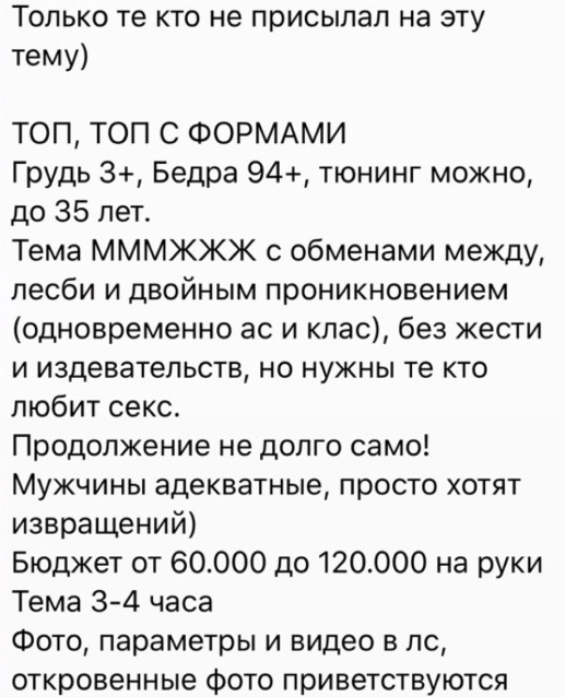 Корреспондент «Ридус» начал изучать этот вопрос и нашел закрытый форум, где обсуждались известные модели — предположительно, имеющие отношение к эскорту. Так, одна из пользовательниц, назвавшаяся скаутом (менеджером) модельного агентства, призналась, что «ценники» сейчас маленькие. По ее словам, если девушка известная (например, имеет популярный аккаунт в Instagram или титулы конкурсов красоты), то сначала ей предлагают 10 тысяч долларов (около 635 тысяч рублей). При этом ценник со временем падает — чем больше на счету девушки поездок и клиентов, тем меньше она получает. Скаут утверждает, что в агентстве, где она работает, половина моделей занимаются эскортом.