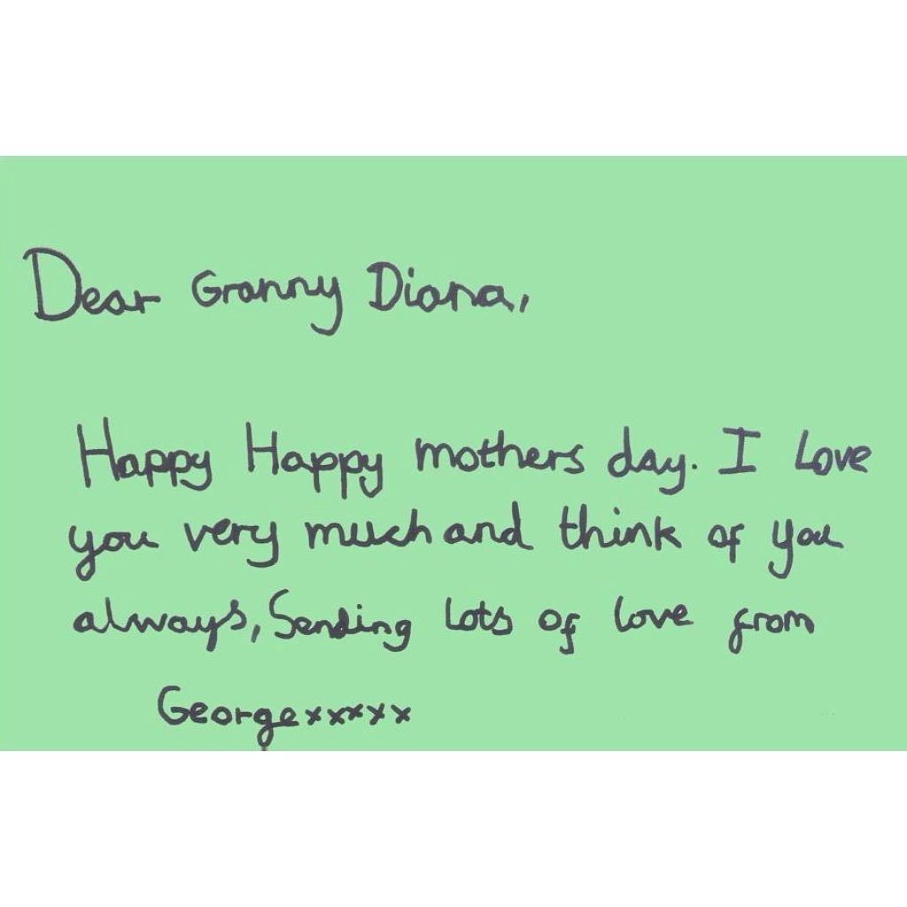 Дорогая бабушка Диана, счастливого, счастливого Дня матери. Я очень тебя люблю и всегда думаю о тебе. С большой любовью, Джордж.