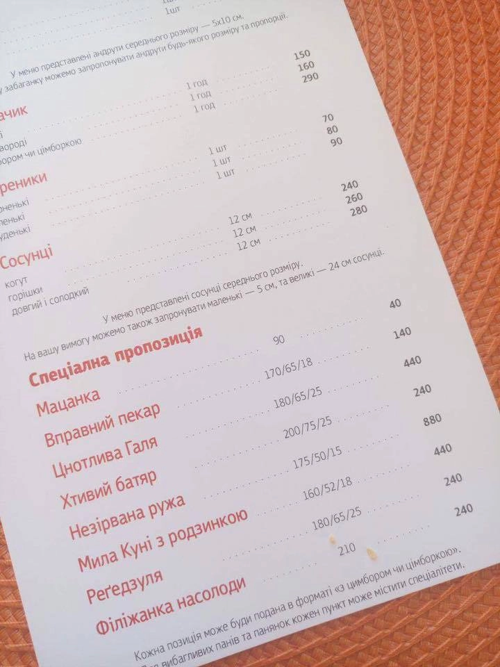 В частности, в заведении предлагают Сосунки маленького, среднего или большого размера (цена от 240 грн), Мацанку (40 грн), Целомудренную Галю (440 грн) и Похотливого батяра (240 грн). Самая дорогая позиция в меню — Несорванная ружа. Она обойдется посетителям в 880 гривен.