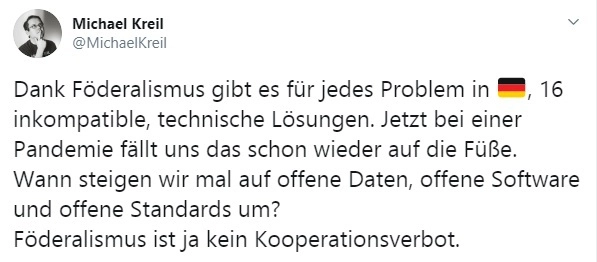 Благодаря федерализму для каждой проблемы в Германии есть 16 несовместимых технических решений. Таким же путем мы встаем на ноги после пандемии… Федерализм не означает запрета на сотрудничество, — пишет пользователь из ФРГ Михаэль Крейль.