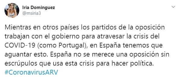 Если в других странах оппозиционные партии сотрудничают с правительством, чтобы победить коронавирус (как в Португалии), то мы, испанцы, об этом можем только мечтать. Испания не заслужила такой безобразной оппозиции, которая использует эпидемию, чтобы получить политические очки, — пишет испанка Ирия Домингес.
