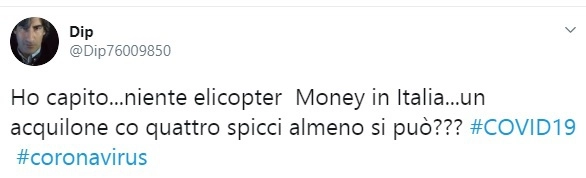 Я понимаю… „вертолетных денег“ в Италии нет… но можно хотя бы запустить воздушного змея с четырьмя монетками? — иронизирует на тему социальной помощи в страдающей от COVID-19 Италии пользователь Dip.
