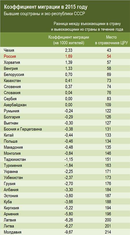 Пожалуй, самый рукопожатный в среде доморощенных либералов, украинских националистов и других русофобов источник информации — World Factbook американского ЦРУ. Эксперты Лэнгли составили рейтинг стран за прошлый год по коэффициенту миграции. Но поскольку нас не интересуют все страны (среди них есть весьма экзотические), то я выбрал только те, с которыми корректно сравнение — из бывшего соцлагеря.