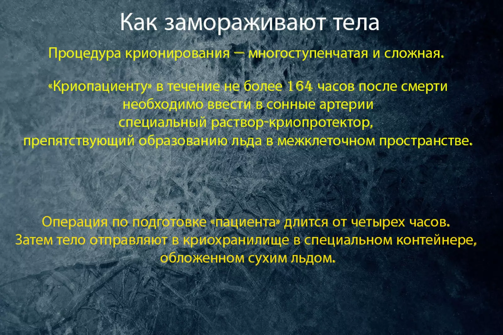 При этом, по словам собеседницы «Ридуса», заморозку успешно применяют на практике — для хранения крови, спермы, эмбрионов для процедур искусственного оплодотворения или кожных тканей, предназначенных для пересадки.