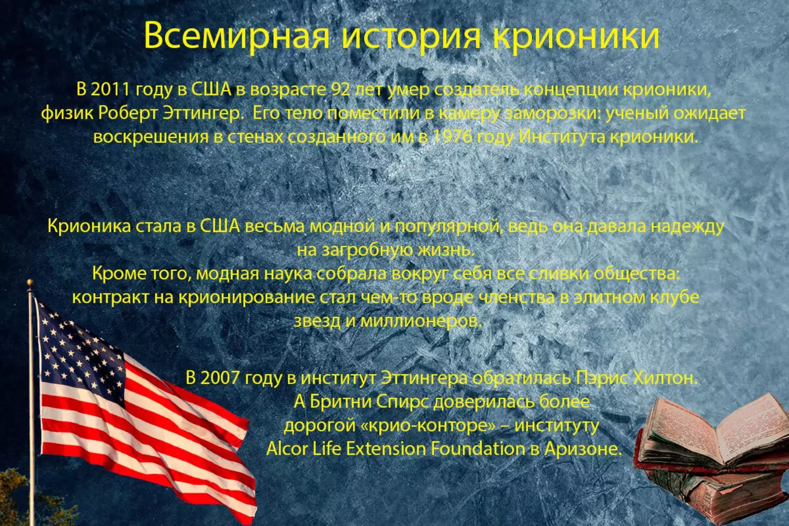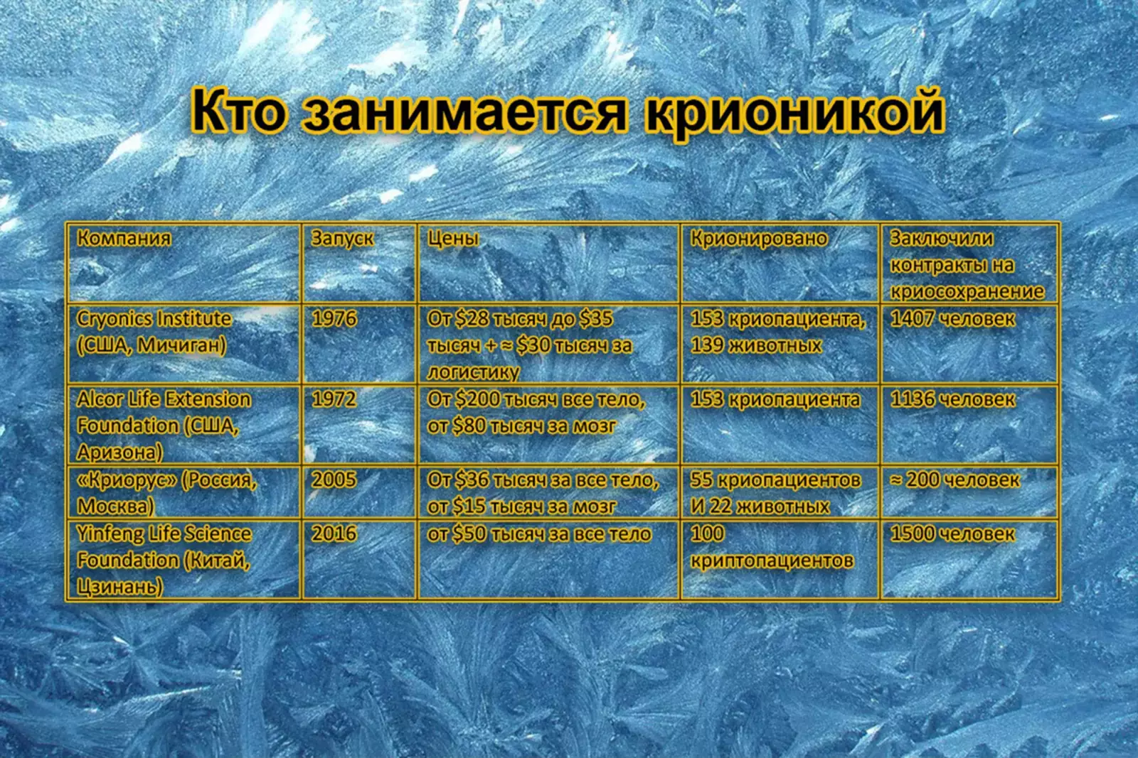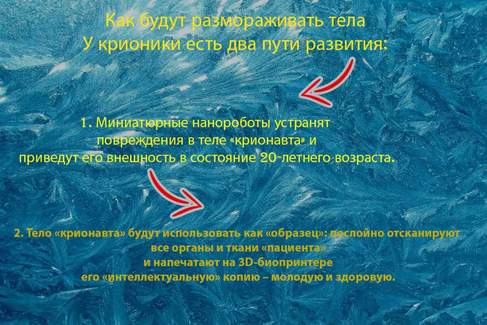 «Есть ученые, которые над этим работают, но, скорее всего, для успехов крионике потребуются не только новые методы разморозки, но и заморозки. И это не очень помогает тем, кто принимает решение сегодня. Пока нет никаких доказательств того, что человека или хотя бы его мозг можно заморозить, а потом успешно разморозить», — уверен ученый.