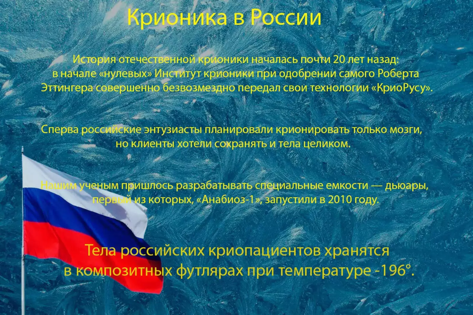 Тем временем ее экс-супруг сетует на то, что отечественное законодательство попросту не способно мыслить о будущем, что является непреодолимым барьером для развития крионики.