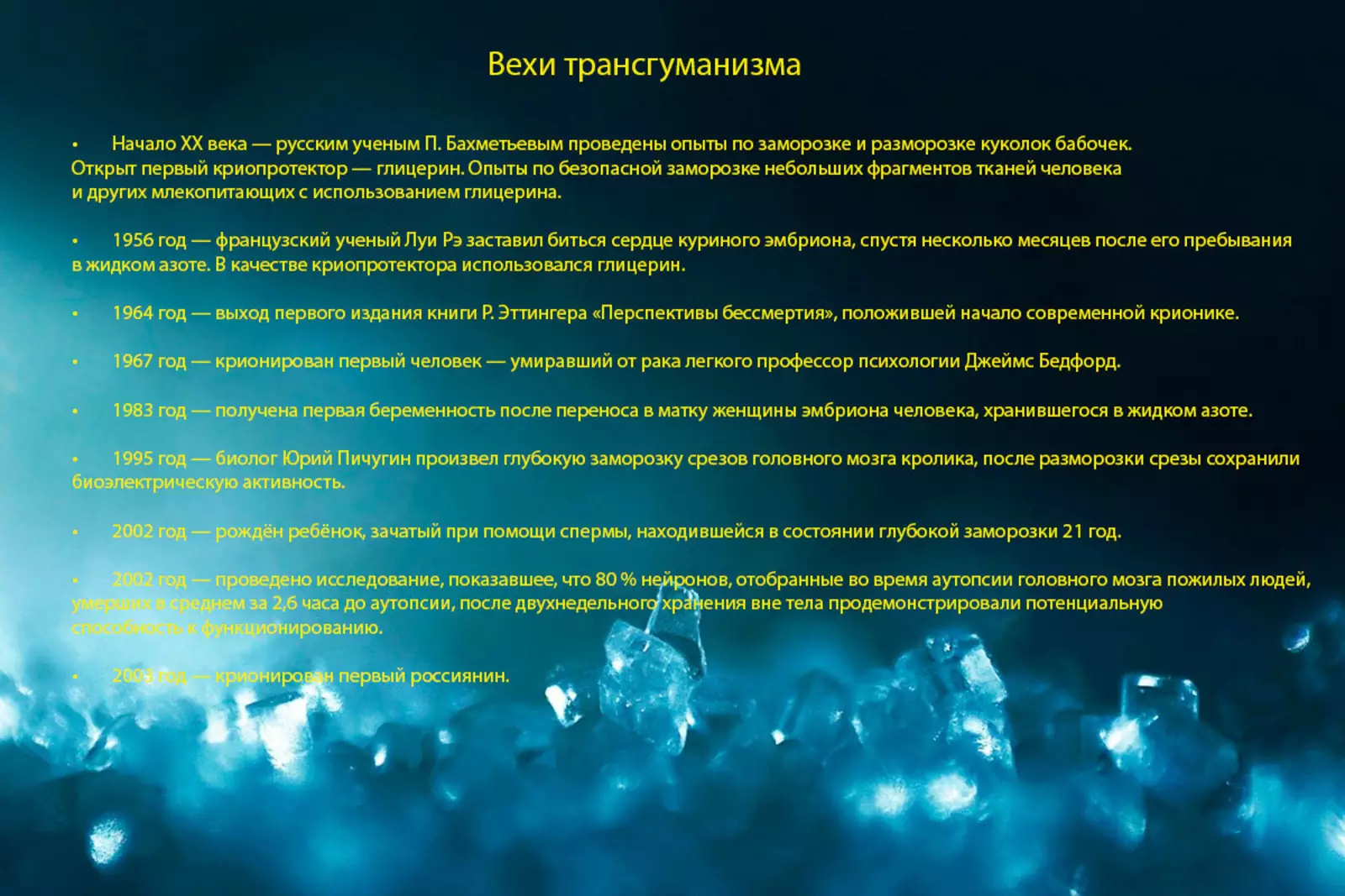 «Сам факт существования крионики дает некоторую мотивацию для очень важных научных исследований в этой области. Очень часто люди, которые занимаются крионикой, вкладываются в разработку криопротекторов — веществ, уменьшающих повреждения клеток тканей при заморозке, и в этой области достигнуты достаточно большие успехи», — говорит Панчин.