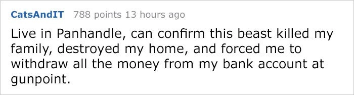 Ходят слухи, что он до сих пор терроризирует ни в чём неповинные семьи во Флориде. Последний раз мы видели его в Южной Каролине, что что-то да и говорит о его прочности».