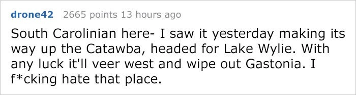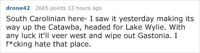 «Я из Южной Каролины — вчера я видел, как мяч катился к Озеру Уили в Катобе. Если повезёт, то он повернёт на запад и уничтожит Гастонию. Ненавижу это место».