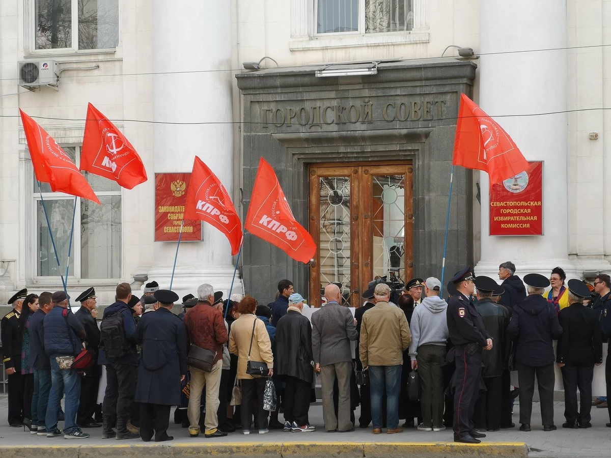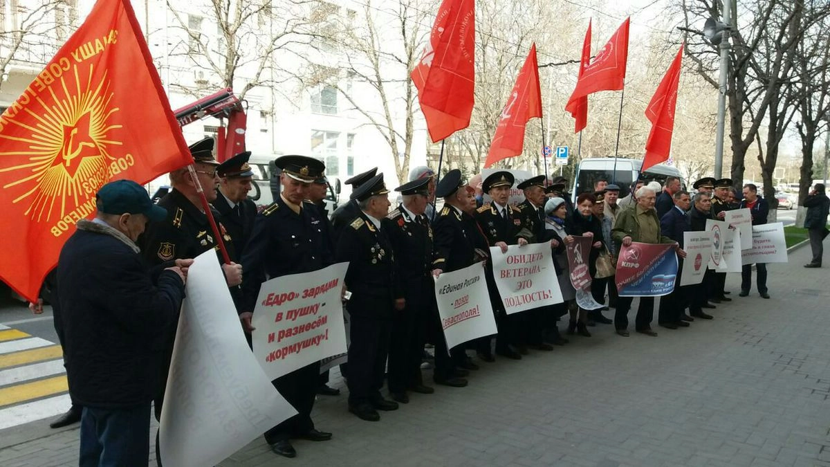 У стен здания заксобрания Севастополя прошел протестный митинг ветеранов: вооружившись флагами КПРФ и плакатами с хлесткими лозунгами, пара десятков митингующих высказали свое недовольство партией «Единая Россия», которая все никак не может принять законопроект о повышении ветеранских выплат ко Дню Победы.