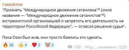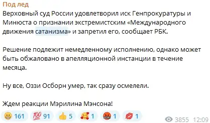 Многие пользователи социальных сетей и Telegram однозначно поддержали запрет дьяволопоклонников в России, подчас подозревая в «прямых отсылах» к сатанистской символике эстраду и телевидение.