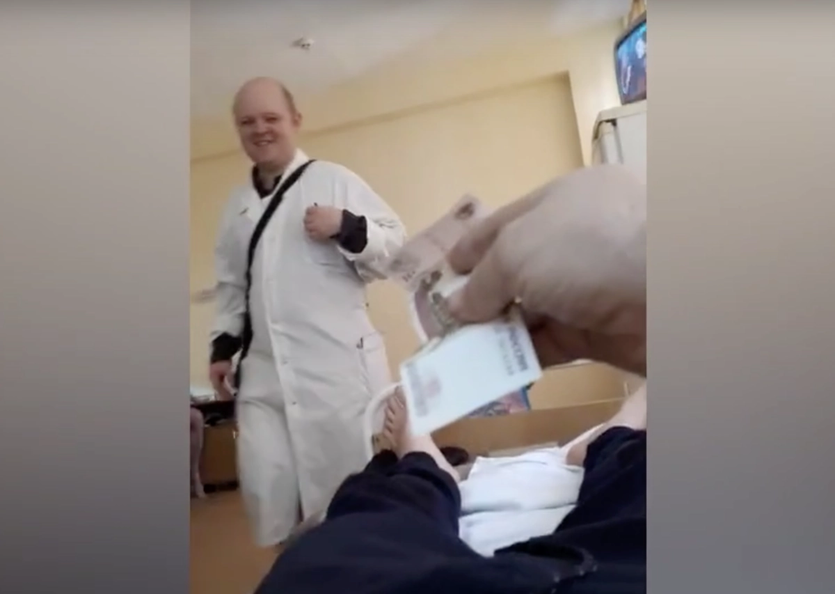 На кадрах видно, как пациент, лежащий на кровати, разговаривает с мужчиной, который представился электриком. Мужчины говорят о телевизоре, затем пациент протягивает сотруднику больницы сторублевую купюру со словами «на, на два дня тебе».