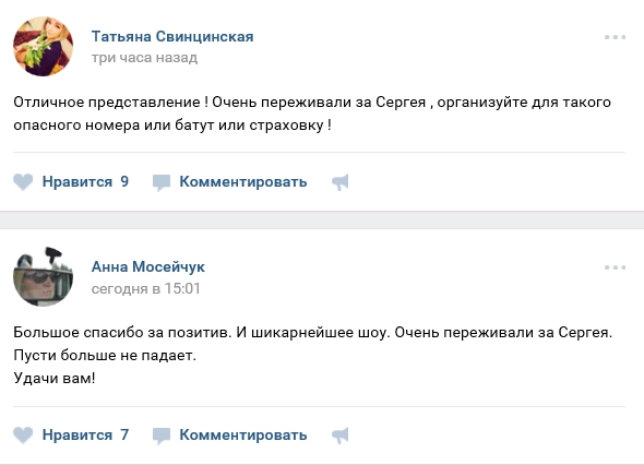 На странице цирка в соцсети "ВКонтакте" зрители отметили, что очень переживали за упавшего артиста, пожелали ему скорейшего выздоровления и чтобы больше не падал.