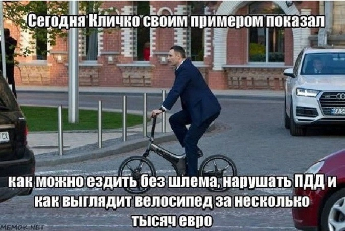 Несколько дней назад Кличко написал на своей странице в социальной сети, что со вторника, 19 апреля, будет ездить на работу и по делам на велосипеде. Однако пользователи сразу заподозрили, что ничем хорошим этот эксперимент не закончится: в Сети появилось множество шуток и фотожаб, связанных с новой инициативой градоначальника.