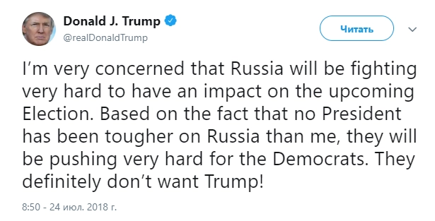 В своем посте американский лидер выразил обеспокоенность тем, что «Россия приложит огромные усилия для того, чтобы повлиять на предстоящие выборы». «Принимая во внимание тот факт, что ни один другой президент не относился к России настолько жестко, как я, они будут изо всех сил пропихивать демократов. Им определенно не нужен Трамп!»