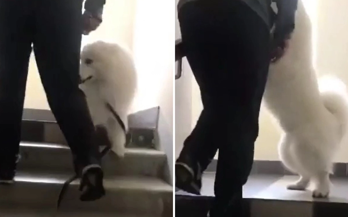«Пап, помоги»: хитрый пес поднимается по лестнице только таким способом