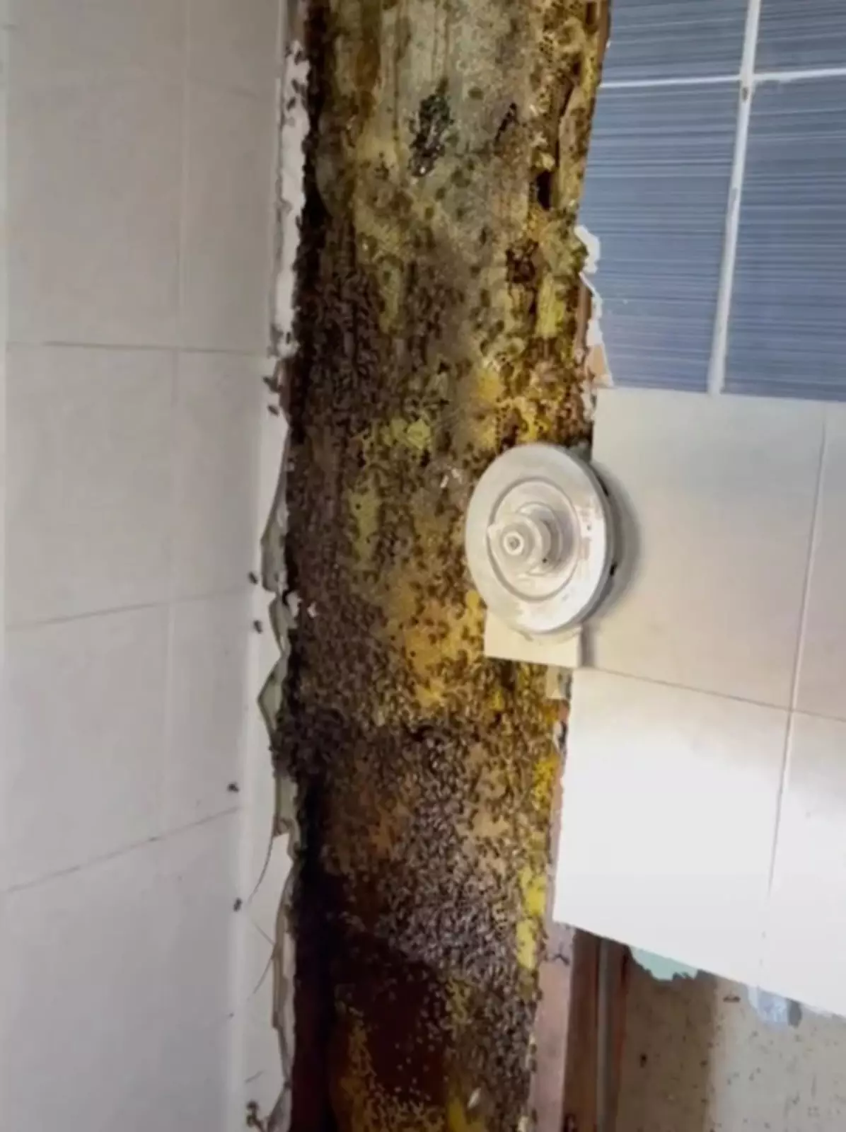Супруги долгое время слышали в ванной жужжание и какую-то возню, но они даже подумать не могли о том, что в стене их дома поселился пчелиный рой. Они сняли часть плитки, и ужаснулись, но, к счастью, пчелы не проявили никакой агрессии, а просто продолжали заниматься своими делами.