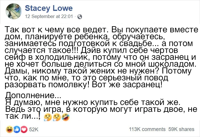 Девушку, у которой отобрали самое ценное, зовут Стейси Лоу. Она поделилась этой забавной историей со своими друзьями в Facebook. Пост быстро стал вирусным и набрал более 52 тысяч лайков и 113 тысяч комментариев