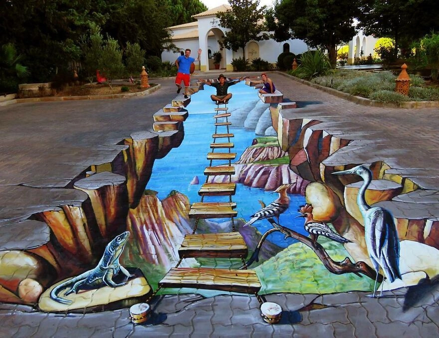 Его творения украшают серые улицы и привлекают огромное количество туристов и местных жителей, жаждущих сделать крутой снимок. Карлос мастерски играет с перспективой и тенями, создавая по-настоящему красочные оптические иллюзии, которые заставляют прохожих на секунду зависнуть и задаться вопросом «Как такое возможно?».
